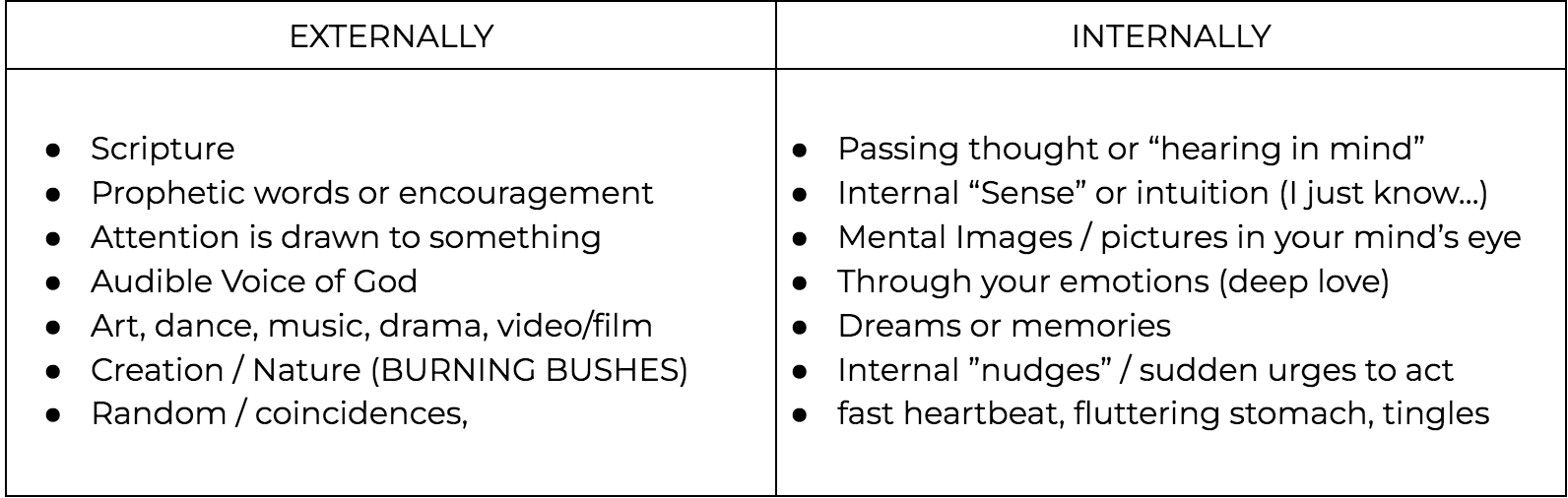 We are fully convinced that God is actively trying to get our attention and that he will use anything to do so. If this idea of hearing God’s voice is new to you, rest assured that you have the ability to hear from him as a Child of God. He made you and will often use your natural tendencies to speak to you. Chances are, you are already hearing him, you just aren’t recognizing it as his voice. Below is a chart of some common ways God speaks. The left side shares examples of things outside of yourself that God will use to spark conversation. The right side are the internal “still small voices” that we can often overlook or dismiss.